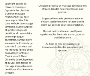 Massage tantrique holistique ( pour femme) Un espace doux et sacré pour te recentrer, te rééquilibrer et retrouver ta force intérieure. Massage tantrique éthique ( pour homme ) Un accompagnement respectueux pour renouer avec ton corps, apaiser l’esprit et retrouver l’ancrage.