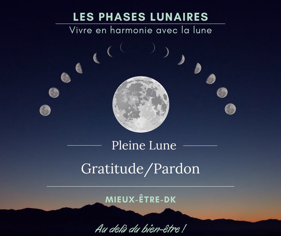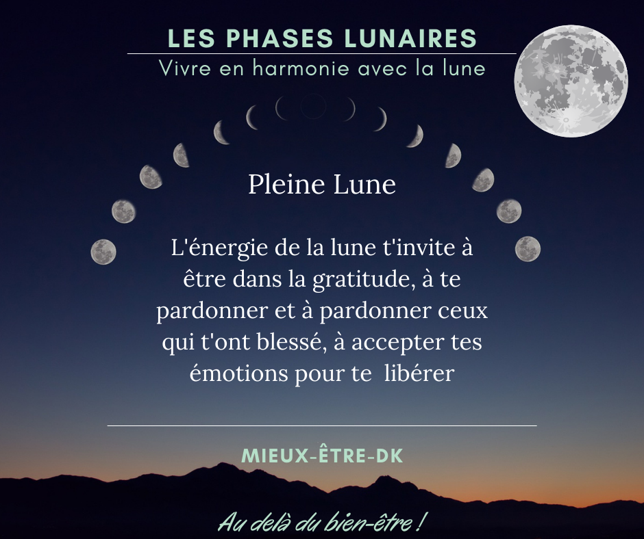 Pleine lune: Gratitude/PardonLa lune est visible totalement dans le ciel. C’est le moment de repos et de pardon. Tu es invité à être dans une énergie de gratitude en t’appuyant sur le chemin intérieur et extérieur parcouru. Et à te pardonner ainsi que les personnes qui t’ont blessé. |