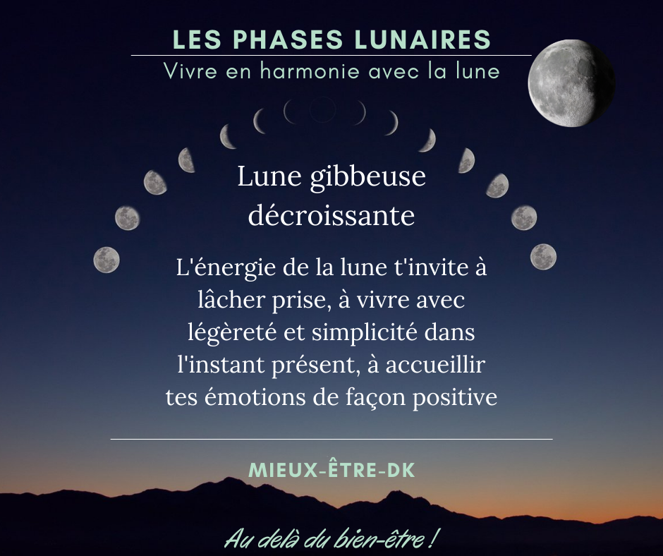 Lune gibbeuse décroissante: DétenteC’est entre le 3e et le 7e jour après la pleine lune. C’est le moment pour s’ancrer dans l’intant présent. |
