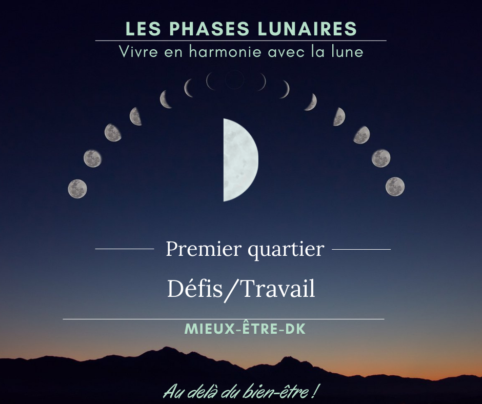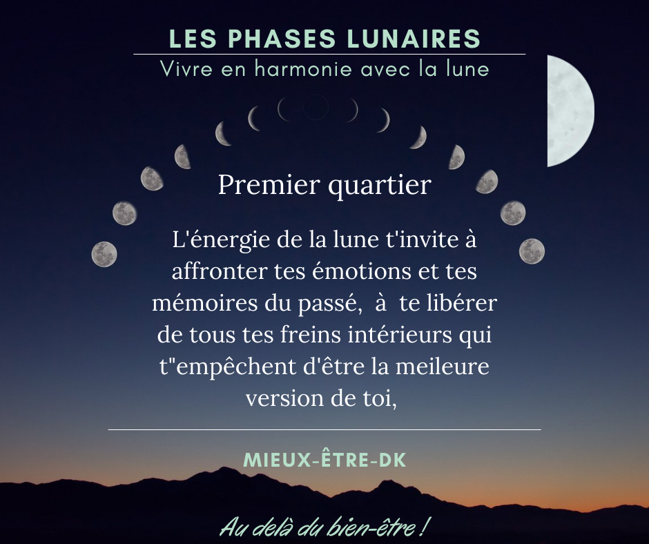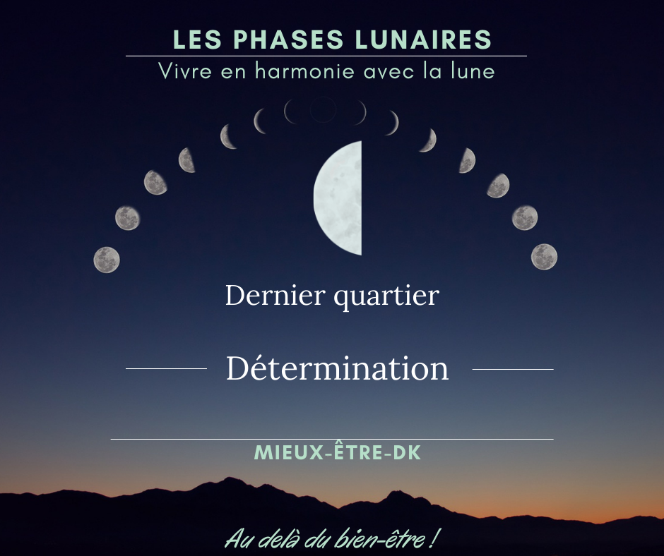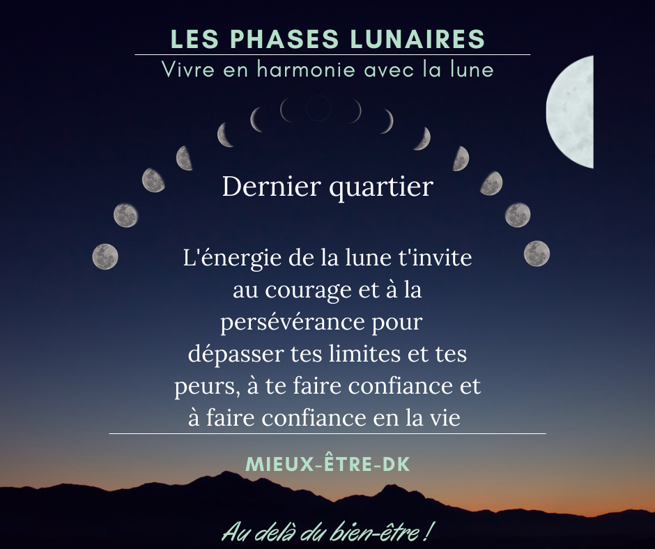 Dernier quartier: DéterminationC’est entre le 7e et le10e jour après la pleine lune. C’est le moment de te connecter avec ta détermination pour continuer ton chemin de vie. Tu es invité à faire preuve de courage et de persévérance pour aller au delà de tes anciennes croyances limitantes et tes peurs. |