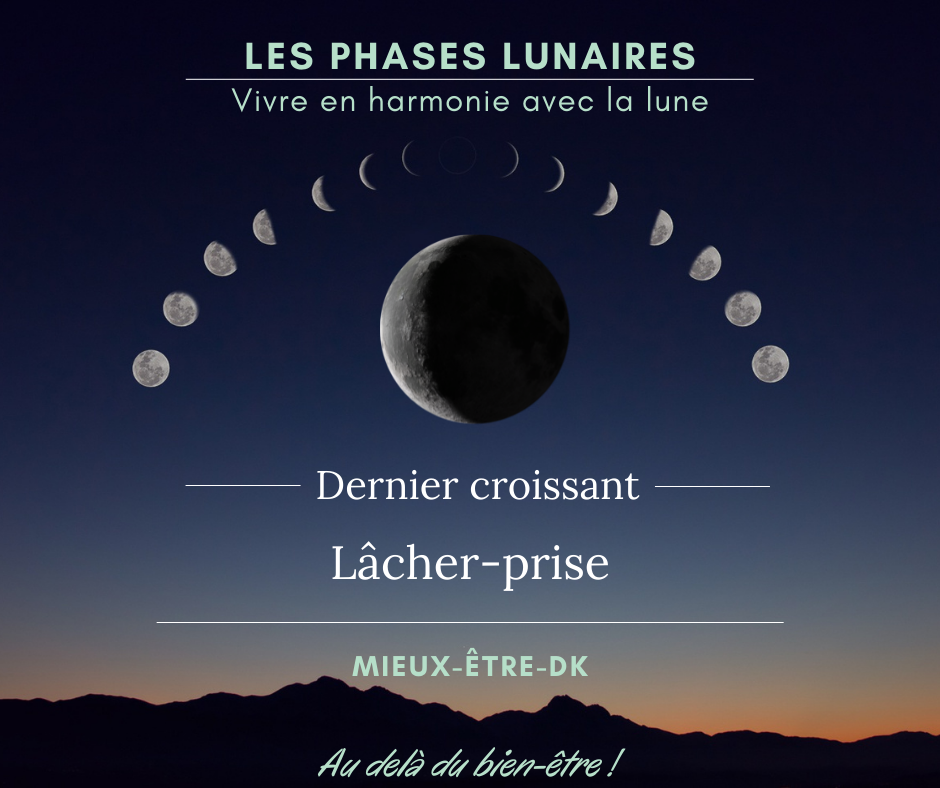 Dernier croissant: Lâcher-priseC’est entre le 10e jour après la pleine lune et la nouvelle lune. C’est le moment pour être dans une énergie de lâcher-prise. |