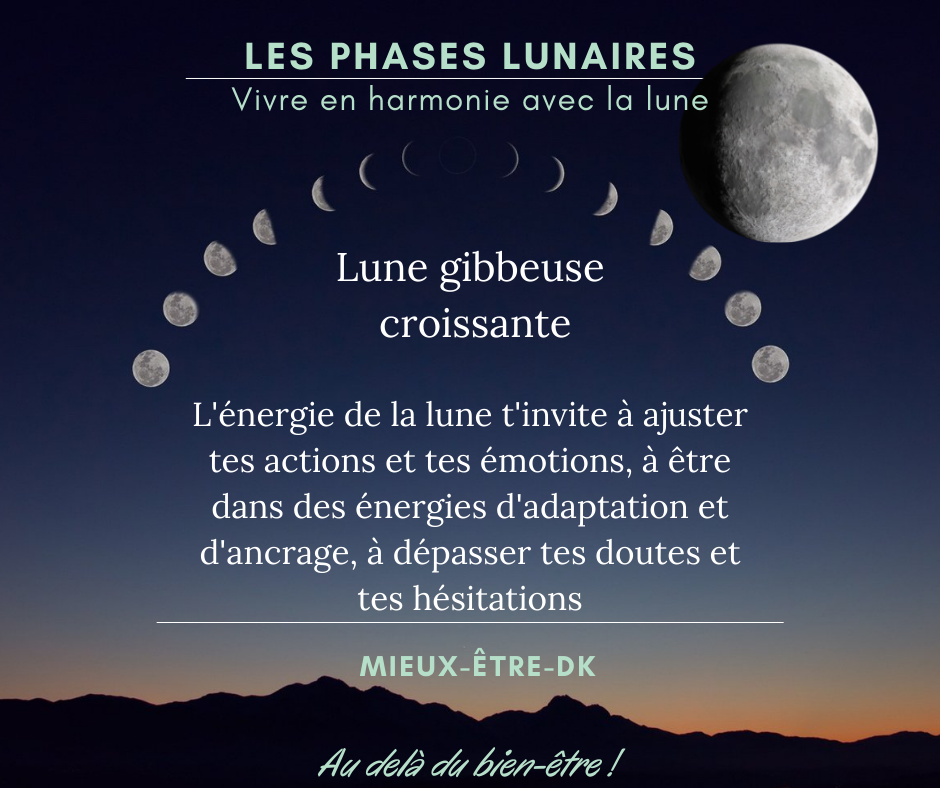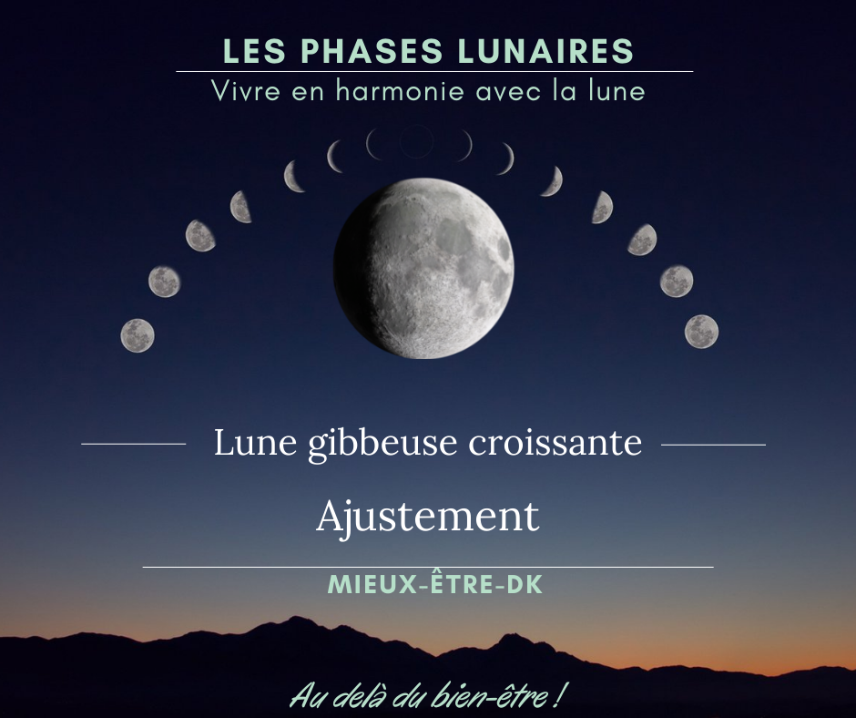 Lune gibbeuse croissante: AjustementC’est entre le 10e et le 15e jour après la nouvelle lune. C’est le moment pour ajuster tes actions et tes émotions pour être dans une avancée stable et durable. |
