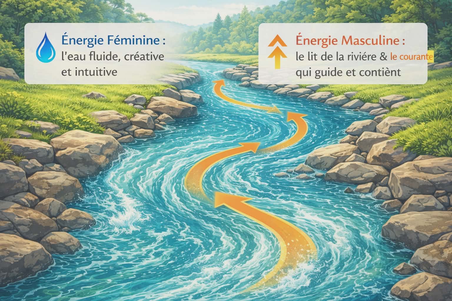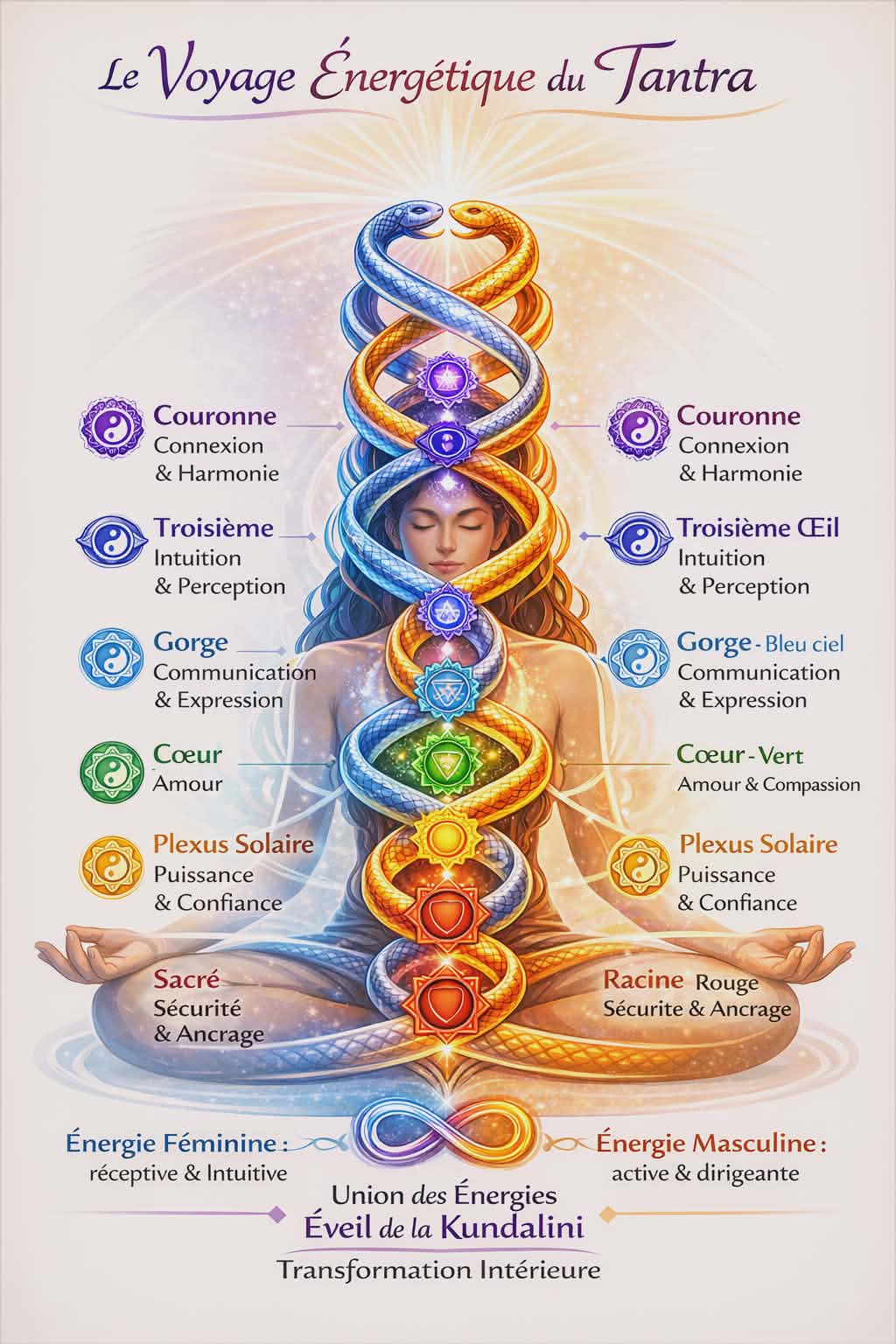 Pour comprendre ce qui se passe vraiment, il faut plonger dans le langage subtil du corps et de l’énergie. Qu’est-ce que l’énergie vitale dans le tantra ?Dans le tantra, on parle souvent de l’énergie sexuelle comme d’un moteur puissant. Mais cette énergie n’est pas seulement sexuelle : c’est une force vitale, un feu intérieur qui peut circuler dans tout le corps et nourrir tous les aspects de ta vie : ton mental, tes émotions et ton esprit. Imagine-la comme un serpent d’énergie appelé Kundalini qui dort à la base de la colonne vertébrale. Lorsqu’elle est éveillée et guidée avec conscience, cette énergie remonte à travers les chakras, transformant sensations et émotions en conscience et vitalité intérieure. Quelle est la différence entre énergie féminine et masculine ?Chaque personne possède à la fois l’énergie féminine (Yin) et l’énergie masculine (Yang). Mais leur rôle est complémentaire. Énergie féminine (Yin)-Réceptive -Intuitive -Fluide -Créative Elle initie : elle fait surgir les idées, les inspirations, les sensations et l’ouverture du corps. Seule, elle reste subtile : l’énergie circule mais n’a pas encore de forme concrète. Énergie masculine (Yang)-Active -Structurante -Dirigeante Elle concrétise et contient : elle organise, transforme et guide l’énergie pour qu’elle circule dans tout le corps, tout en la sécurisant et en lui donnant une forme. Sans elle, les sensations initiées par l’énergie féminine restent en suspension et ne se transforment pas en énergie intégrée. Comment circulent l’énergie féminine et masculine ? (Exemple de la rivière)Imagine ton énergie comme une rivière. Énergie féminine = l’eau : fluide, vivante, créative et intuitive. Elle jaillit, se déplace, explore et initie le mouvement. Énergie masculine = le lit et le courant : le lit contient et structure l’eau, lui donne une forme. Le courant guide le mouvement et donne une direction au flux. Sans le lit de la rivière, l’eau se disperserait. Sans l’eau, la rivière n’existerait pas. L’équilibre entre ces deux forces permet un flux harmonieux de l’énergie. Comment l’énergie circule-t-elle dans les chakras ?L’énergie vitale circule le long des chakras, centres énergétiques correspondant à différentes dimensions de l’être. Sa trajectoire n’est pas rectiligne : elle se déplace souvent en spirale ou en mouvement ondulatoire, comme un serpent qui se déplace le long de la colonne vertébrale. Chakra racine (Muladhara)Situé à la base de la colonne vertébrale Lié à la sécurité, l’ancrage et la vitalité physique Point de départ de la Kundalini endormie Chakra sacré (Svadhisthana)Situé dans le bas-ventre Associé à la créativité, aux émotions et à la sensualité Chakra du plexus solaire (Manipura)Situé au niveau de l’estomac Gouverne la puissance personnelle, la confiance et la capacité d’agir Chakra du cœur (Anahata)Situé au centre de la poitrine Représente l’amour, la compassion et l’ouverture aux autres Chakra de la gorge (Vishuddha)Situé au niveau de la george Associé à la communication et l’expression de soi Chakra du troisième œil (Ajna)Situé entre les sourcils Lié à l’intuition, la perception et la conscience intérieure Chakra couronne (Sahasrara)Situé au sommet de la tête Représente la connexion à l’infini et l’harmonie entre corps et esprit Pourquoi l’énergie ne se perd-elle pas ?Contrairement à ce que beaucoup imaginent, le massage tantrique ne cherche pas une stimulation orgasmique finale. L’énergie sexuelle est plutôt canalisée et élevée, circulant à travers les chakras et nourrissant tout l’être. Cette circulation harmonieuse permet de : Libérer les tensions du corps Éveiller la conscience corporelle et émotionnelle Rééquilibrer les énergies féminine et masculine Pourquoi le massage tantrique est un voyage intérieur ?Le massage tantrique n’est pas seulement une expérience physique. C’est une danse de l’énergie. En laissant circuler l’énergie féminine et masculine à travers la Kundalini et les chakras, on se reconnecte à : Sa vitalité Son plaisir d’exister Son équilibre émotionnel et intérieur Le tantra transforme les sensations en énergie consciente et permet de se reconnecter profondément à son être. FAQ – Questions fréquentes sur l’énergie tantriqueQu’est-ce que l’énergie tantrique ?L’énergie tantrique est une forme d’énergie vitale qui circule dans le corps. Elle peut être éveillée et guidée pour nourrir le corps, les émotions et la conscience. Qu’est-ce que la Kundalini ?La Kundalini est une énergie vitale représentée comme un serpent endormi à la base de la colonne vertébrale. Lorsqu’elle s’éveille, elle circule à travers les chakras, transformant sensations et émotions en conscience. Que sont les chakras ?Les chakras sont des centres énergétiques situés le long de la colonne vertébrale. L’énergie vitale qui les traverse influence l’équilibre physique, émotionnel et spirituel. Qu’est-ce qu’un massage tantrique ?Le massage tantrique est une approche du toucher qui favorise la circulation de l’énergie vitale. Il permet de reconnecter les sensations, les émotions et la respiration pour créer l’harmonie corps-esprit. Comment fonctionne un massage tantrique ?Le massage tantrique repose sur la circulation de l’énergie le long de la colonne vertébrale et des chakras. Le toucher, la respiration et la présence permettent à l’énergie de circuler librement. Le massage tantrique peut-il éveiller la Kundalini ?Oui, il peut favoriser un éveil progressif de la Kundalini, qui se manifeste par des sensations de chaleur, de circulation ou de vitalité dans le corps. Peut-on ressentir l’énergie circuler pendant un massage tantrique ?Certaines personnes ressentent des picotements, des vibrations ou une sensation de flux énergétiqu