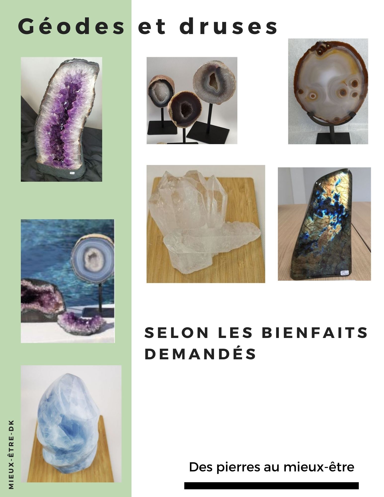 Je propose à la vente des objets et compositions autour des pierres de lithothérapie : géodes, bijoux, pierres roulées, etc., ainsi que des compositions personnalisées.